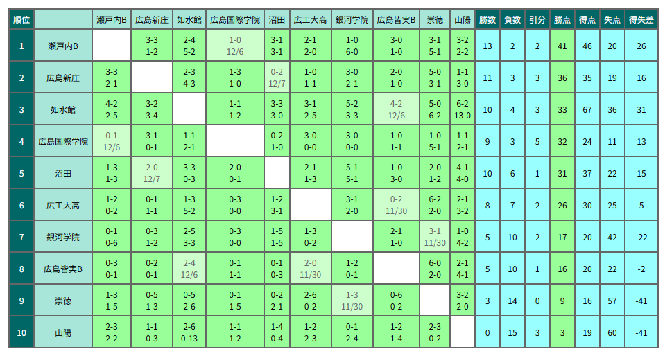 1位:瀬戸内B、如水館、広島新庄、広島国際学院、沼田、広島皆実B、山陽、広工大高、銀河学院、崇徳