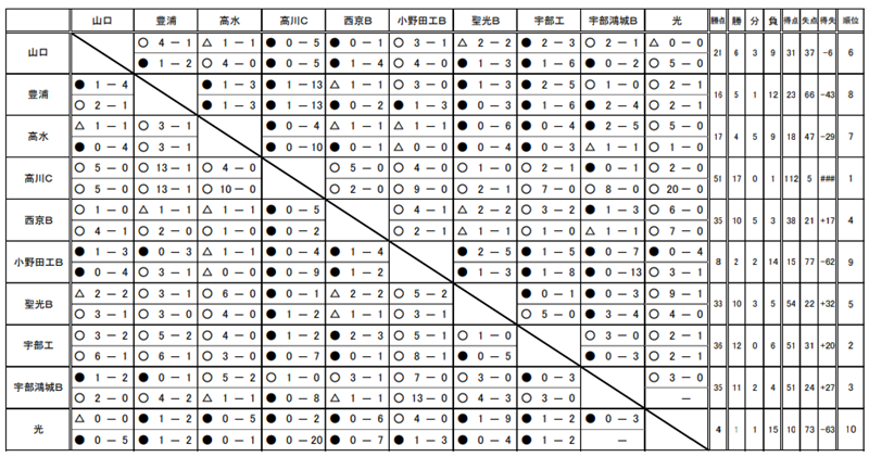 防府西、聖光C、山口中央、レノファ山口セカンド、桜ケ丘、小野田、下関西、西京C