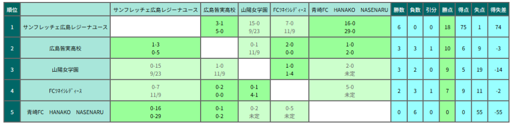 サンフレッチェ広島レジーナユース、広島皆実高校、青崎FC HANAKO NASENARU、山陽女学園、FCツネイシレディース