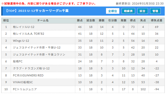 1位:柏レイソルU-12、2位:柏レイソルA.A. TOR’82、3位:Wings U-12、4位:ジェフユナイテッド市原・千葉U-12、5位:ジェフユナイテッド市原・千葉コラソン、6位:船橋FC、7位:クラブ・ドラゴンズ柏 U-12、8位:FC市川GUNNERS RED、9位:VIVAIO船橋SC、10位:FCトリムジュニア