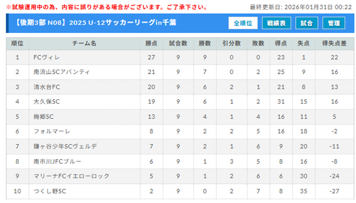 1位:VIVAIO船橋SC、2位:市川MFCフォックス、3位:峰台FC、4位:エンデバーFC、5位:初石ヴェルメリオ、6位:ヴィスポ柏99FC、7位:FC鬼高、8位:白井FC、9位:流山東部FC、10位:FORZA!沼南
