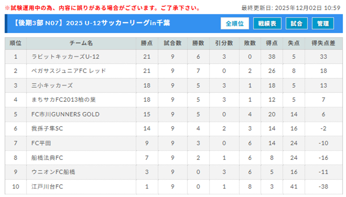 1位:FCアクティブ柏、2位:VIVAIO船橋SC U-12、3位:DUC SC、4位:行田東FC、5位:フォルマーレ、6位:市川北FC、7位:FC MONO、8位:滝野FC、9位:ペガサスジュニアFC ブルー、10位:鎌ヶ谷少年SCヴィオラ