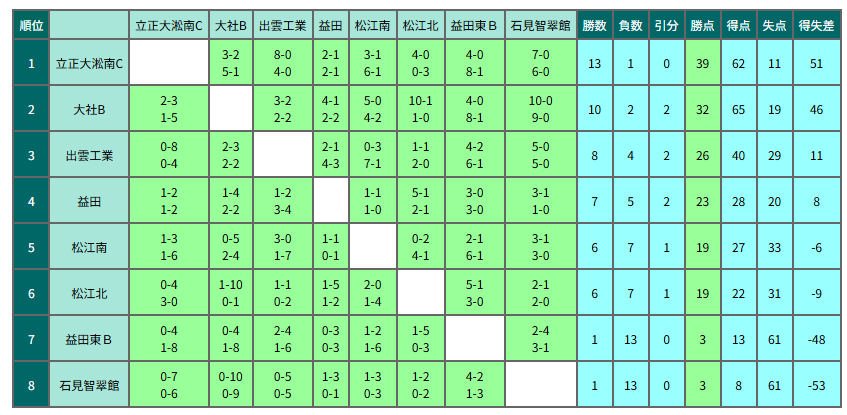 1位:大社、2位:立正大淞南B、3位:益田東、4位:明誠、5位:開星、6位:松江商業、7位:出雲、8位:松江東