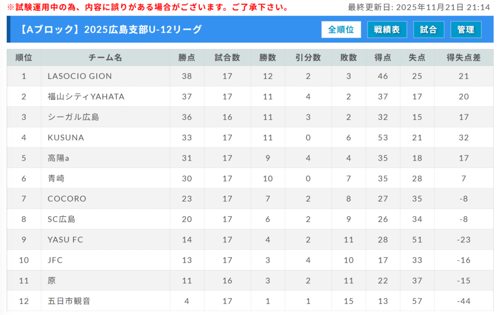 LASOCIO GION、原、COCORO、YASU FC、SC広島、KUSUNA、青崎、高陽a、JFC、シーガル広島、福山シティYAHATA、五日市観音