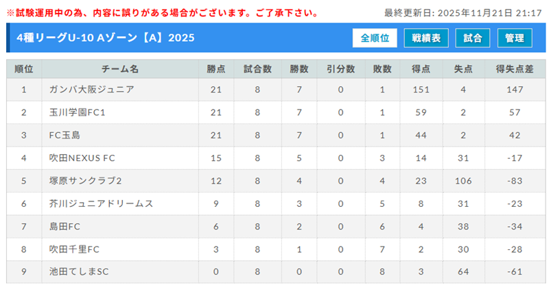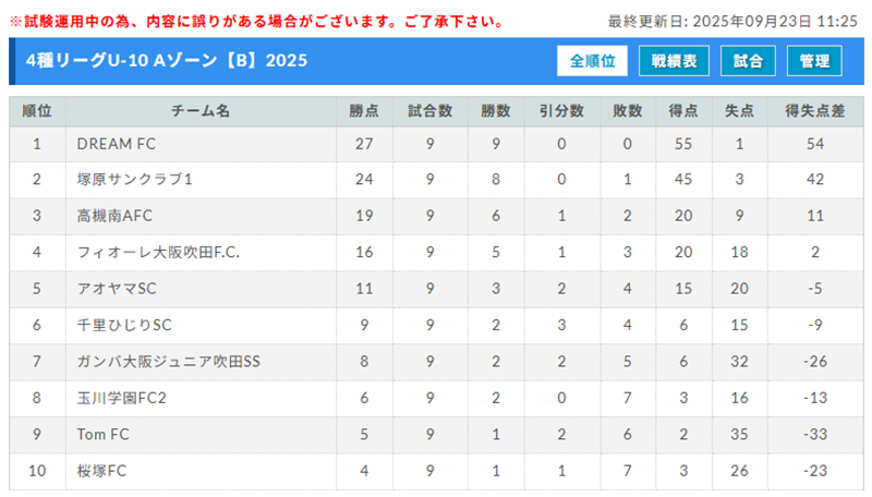 1位:DREAM FC、2位:塚原サンクラブ1、3位:高槻南AFC、4位:フィオーレ大阪吹田F.C.、5位:アオヤマSC、6位:千里ひじりSC、7位:ガンバ大阪ジュニア吹田SS、9位:Tom FC、8位:玉川学園FC2、10位:桜塚FC