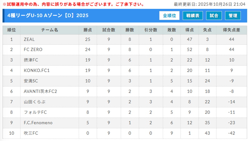 1位:ZEAL、2位:FC ZERO、3位:摂津FC、4位:KONKO.FC1、5位:安満SC、6位:AVANTI茨木FC2、7位:山田くらぶ、8位:フォルテFC、9位:F.C.Fenomeno、10位:吹三FC