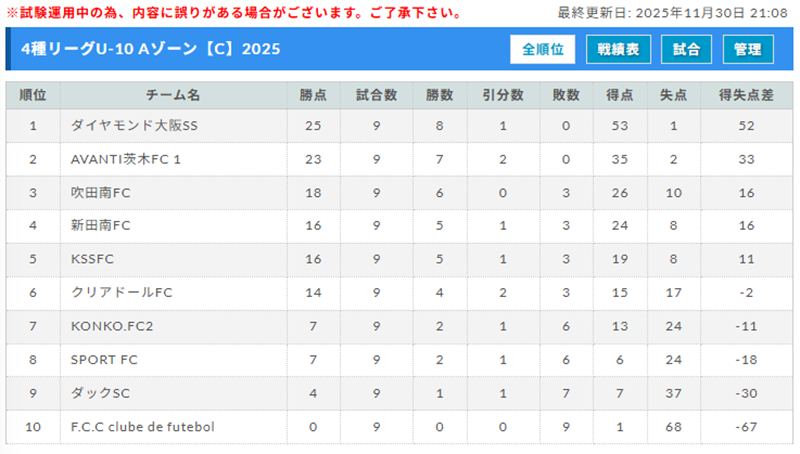 1位:ダイヤモンド大阪SS、2位:AVANTI茨木FC 1、3位:吹田南FC、4位:新田南FC、5位:KSSFC、6位:クリアドールFC、7位:KONKO.FC2、8位:SPORT FC、9位:ダックSC、10位:F.C.C clube de futebol
