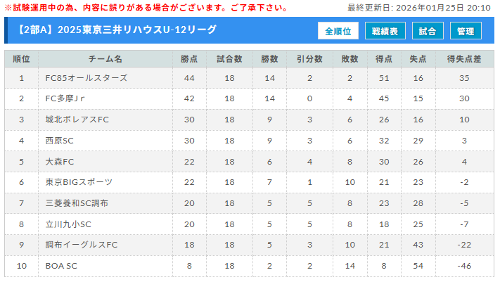 1位:FC85オールスターズ、2位:FC多摩Jr、3位:城北ボレアスFC、4位:西原SC、5位:大森FC、6位:東京BIGスポーツ、7位:三菱養和SC調布、8位:立川九小SC、9位:調布イーグルスFC、10位:BOA SC