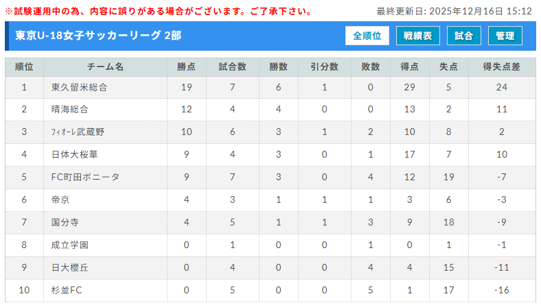 東久留米総合高校、晴海総合高校、日本体育大学桜華高校、フィオーレ武蔵野FC、帝京高校、成立学園高校、国分寺高校、日本大学櫻丘高校、FC町田ボニータ、杉並FC