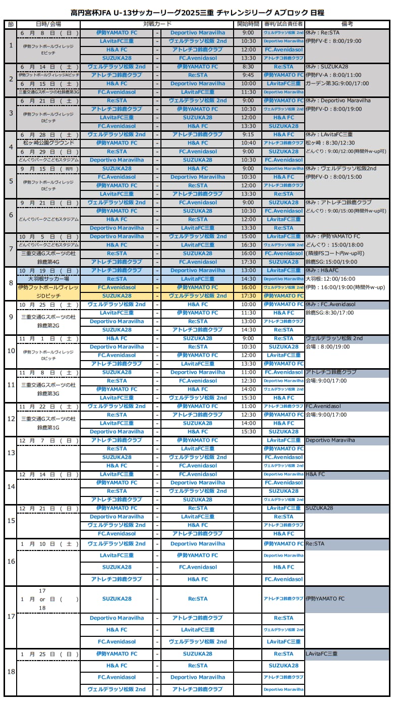 FC.Avenidasol、H&AFC、アトレチコ鈴鹿クラブ、伊勢YAMATO FC、ヴェルデラッソ松阪2nd、LAvitaFC三重、Deportivo Maravilha、Re:STA、SUZUKA28FC