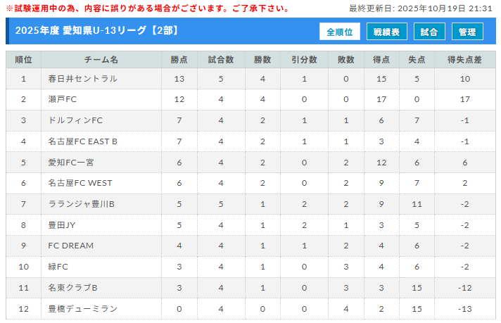 2024年度 愛知県U-13サッカーリーグ TOP・1部・2部 全ブロック終了!TOPリーグ優勝はグランパスみよし!最終順位掲載!