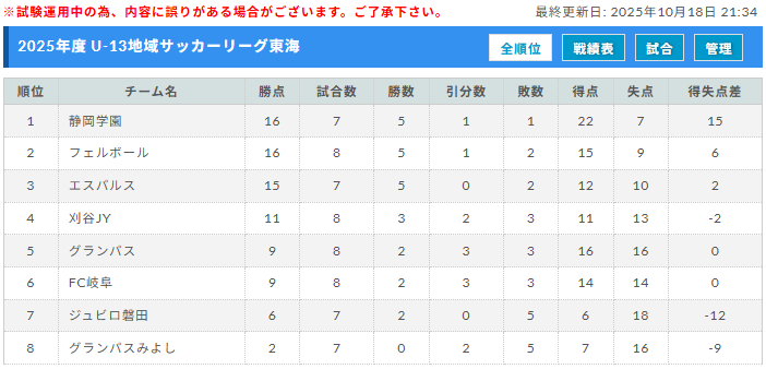 10/13 11:00 静岡学園中 7-2 グランパスみよし第6節(10/4,5)