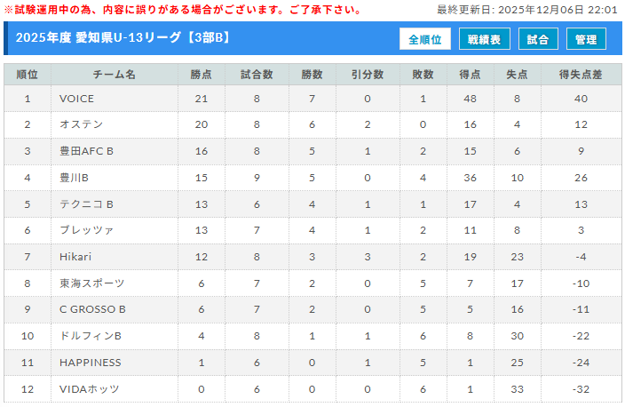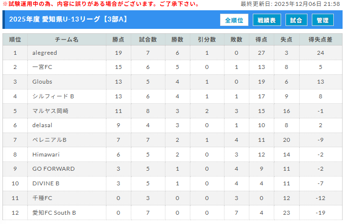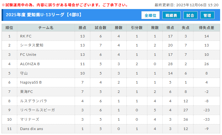 2025年度 愛知県U-13サッカーリーグ3部・4部 12/6結果更新!入力ありがとうございます!12/7結果速報
