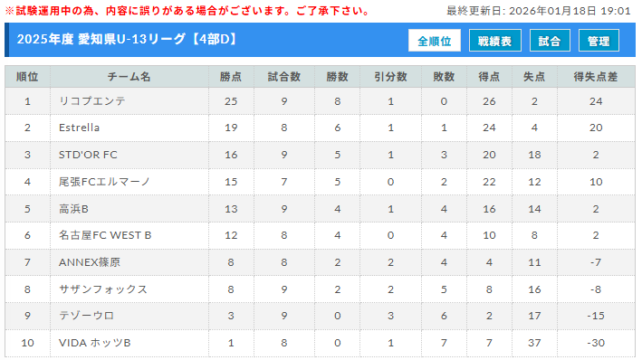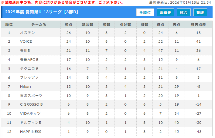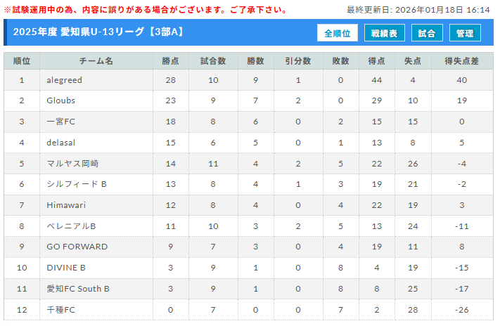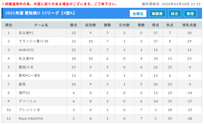 2025年度 愛知県U-13サッカーリーグ3部・4部 1/17、18結果更新!入力ありがとうございます!次回1/24,25