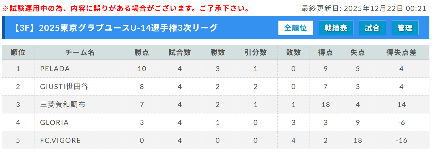 三菱養和調布、FC.VIGORE、GIUSTI世田谷、1位:PELADA、GLORIA