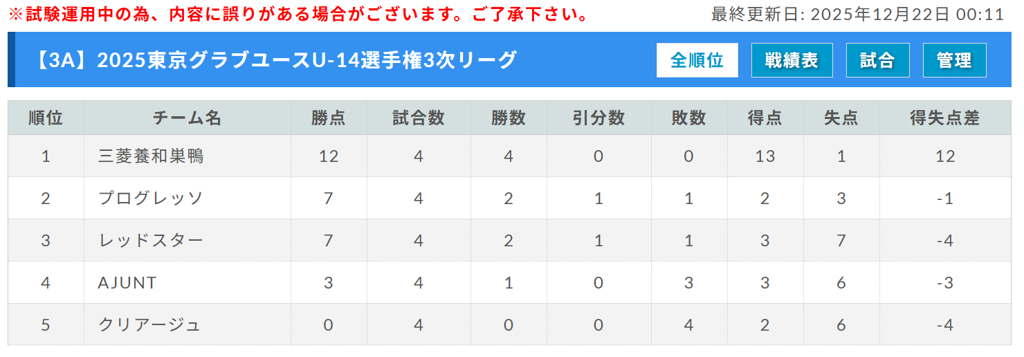 クリアージュ、レッドスター、プログレッソ、AJUNT、1位:三菱養和巣鴨