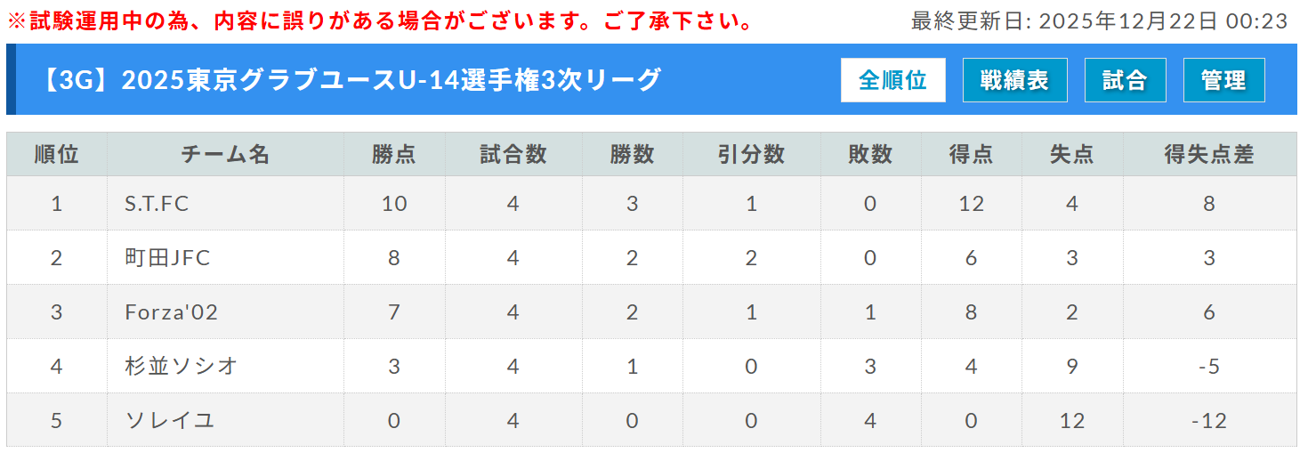 ソレイユ、町田JFC、杉並ソシオ、1位:S.T.FC、Forza’02