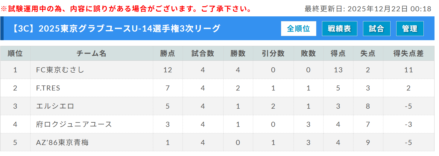F.TRES、エルシエロ、府ロクジュニアユース、AZ’86東京青梅、1位:FC東京むさし