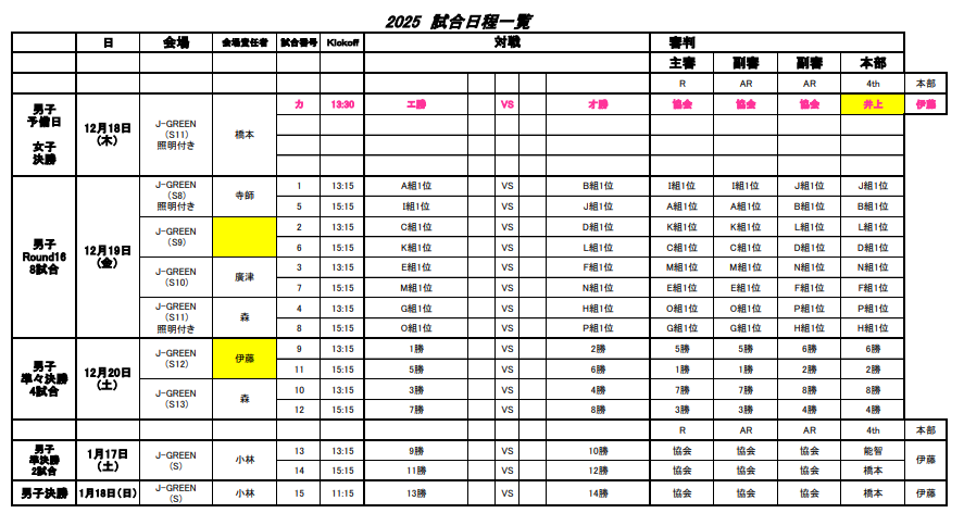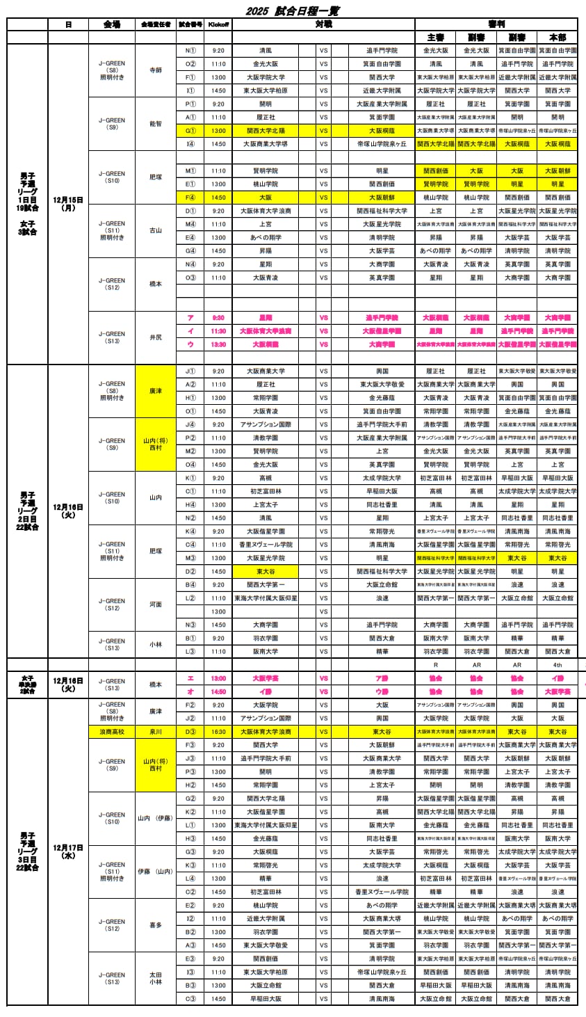 予選リーグ戦積表 12/15.16.17 全試合終了