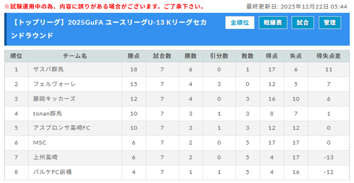 2025年度 GuFA ユースリーグU-13(Kリーグ・群馬)順位決定リーグ 12/27結果更新!トップリーグ優勝はザスパ群馬!セカンドリーグ、サードリーグ次節開催日情報募集
