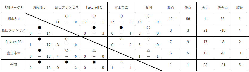 富士市立、高校藤枝順心3rd、島田プリンセス、FC Fukuroiレディース、合同(清水国際・沼津西・島田樟誠)