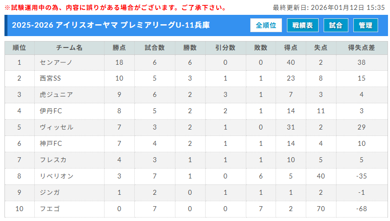 プレミアリーグU-11兵庫 1/10結果更新