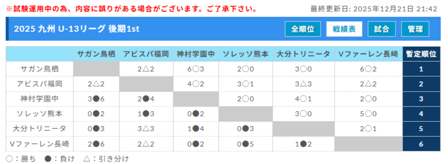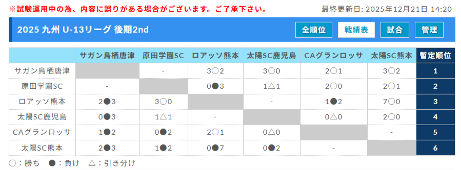 ※こちらは公式結果ではありません。リーグ戦入力にて誤差が生じますので、正式結果は公式結果を確認してください。