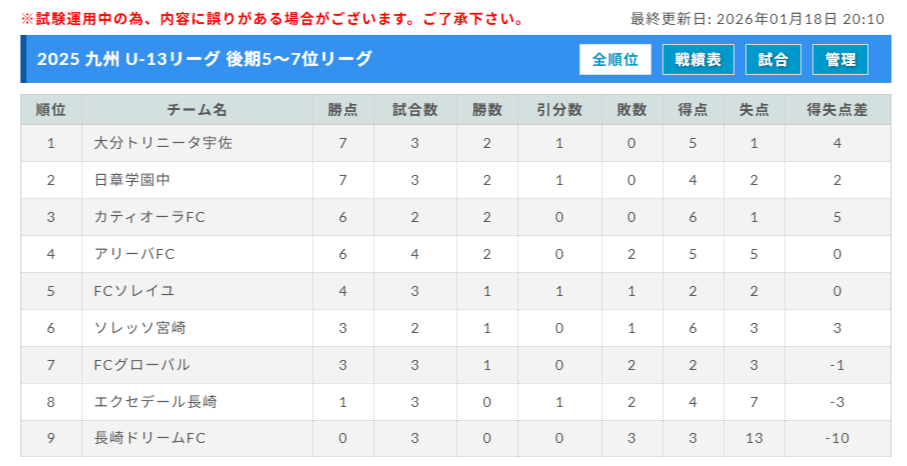1位:サガン鳥栖、2位:Vファーレン長崎、3位:太陽SC鹿児島、4位:ロアッソ熊本、5位:日章学園中、6位:カティオーラ、7位:FCグローバル