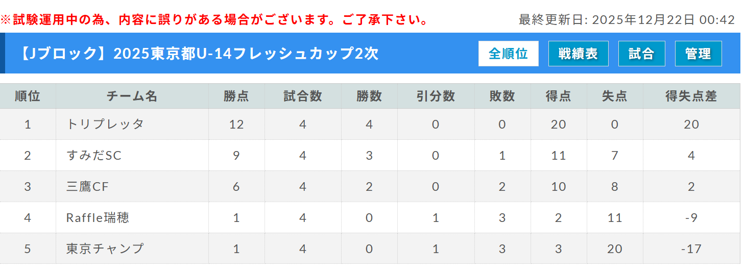 トリプレッタ、東京チャンプ、三鷹CF、Raffle瑞穂、すみだSC