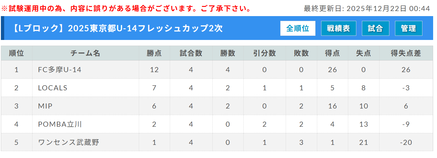 MIP、LOCALS、POMBA立川、FC多摩U-14、ワンセンス武蔵野