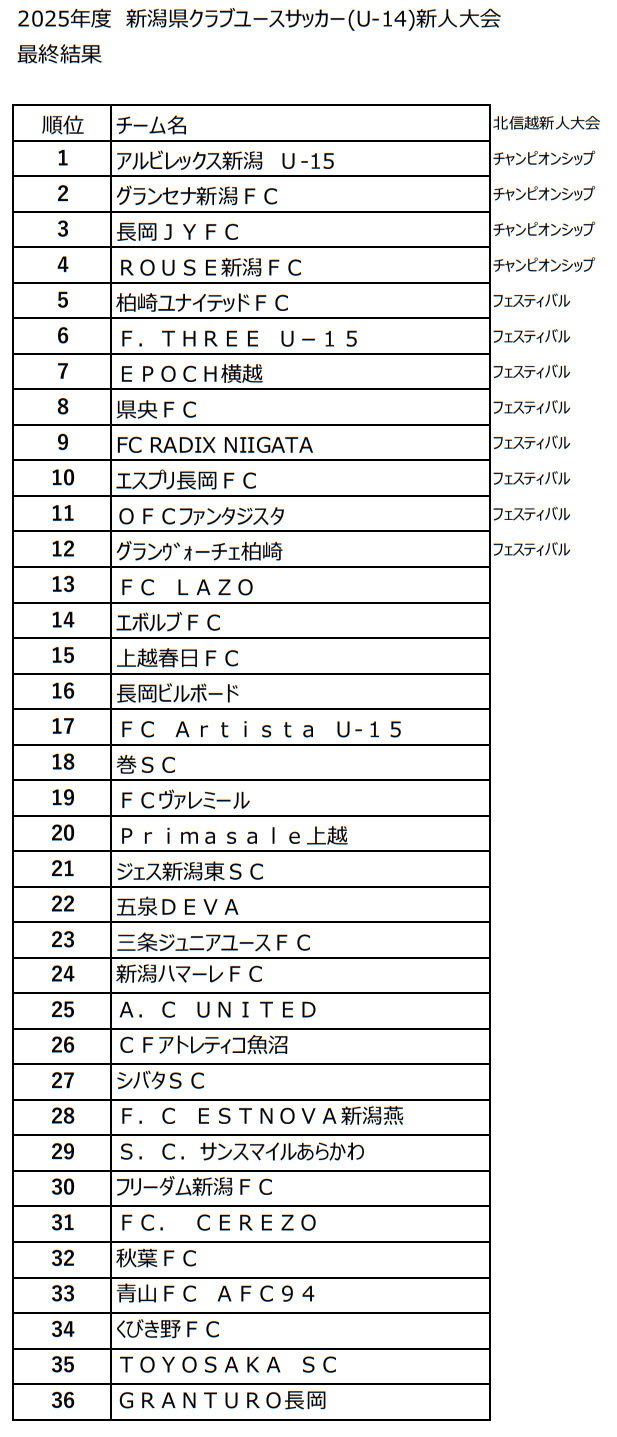 ②準備加盟クラブは、北信越クラブユースサッカー(U-14)新人大会への出場が認められていない為、優勝及び準優勝に入賞した場合は、そのチームを除いて順位を繰り上げる。