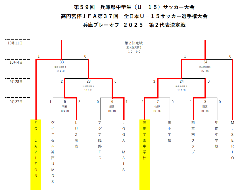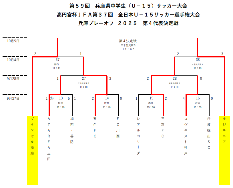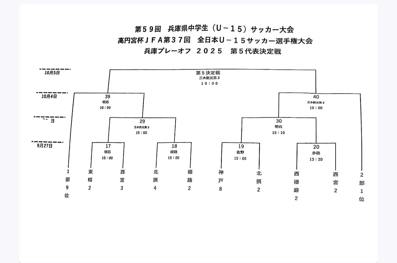 2025年度 第59回兵庫県中学生(U-15)サッカー選手権大会(高円宮杯)兵庫プレーオフ 第5代表決定戦組合せ。