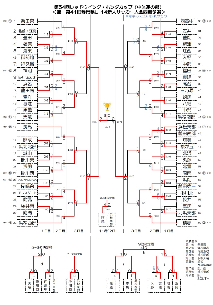 ※中体連の部は、優勝チームの磐田東とシードの浜松開誠館が中体連チャンピオンシップを11/23に行い、中体連一位二位を決定