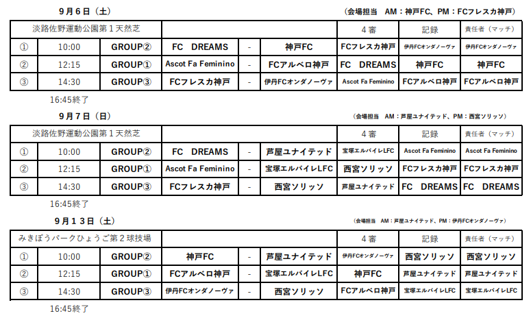 他参照:Ascot FA Feminino、FCアルベロ神戸、宝塚エルバイレLFC、FC DREAMS、芦屋ユナイテッド、FCフレスカ神戸