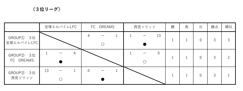 1位:西宮ソリッソ、2位:FC DREAMS、3位:宝塚エルバイレLFC