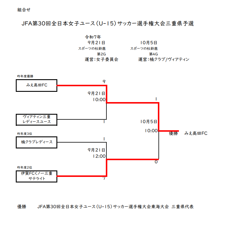 1位のチームが高円宮妃杯 JFA 第 30 回全日本 U-15 女子サッカー選手権大会に三重県代表として出場できる。