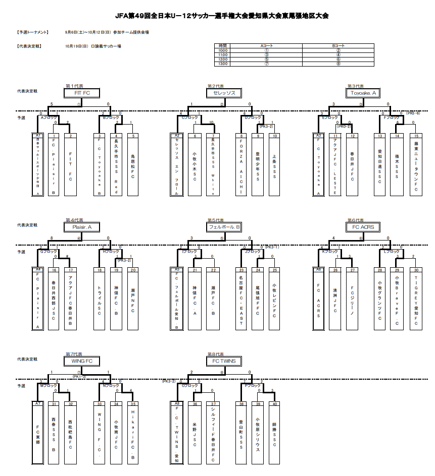 ・東尾張U12リーグのAブロック9チーム、Bブロック9チーム、Cブロック29チームの計47チームを9ブロックに分けて代表トーナメント戦を行う。