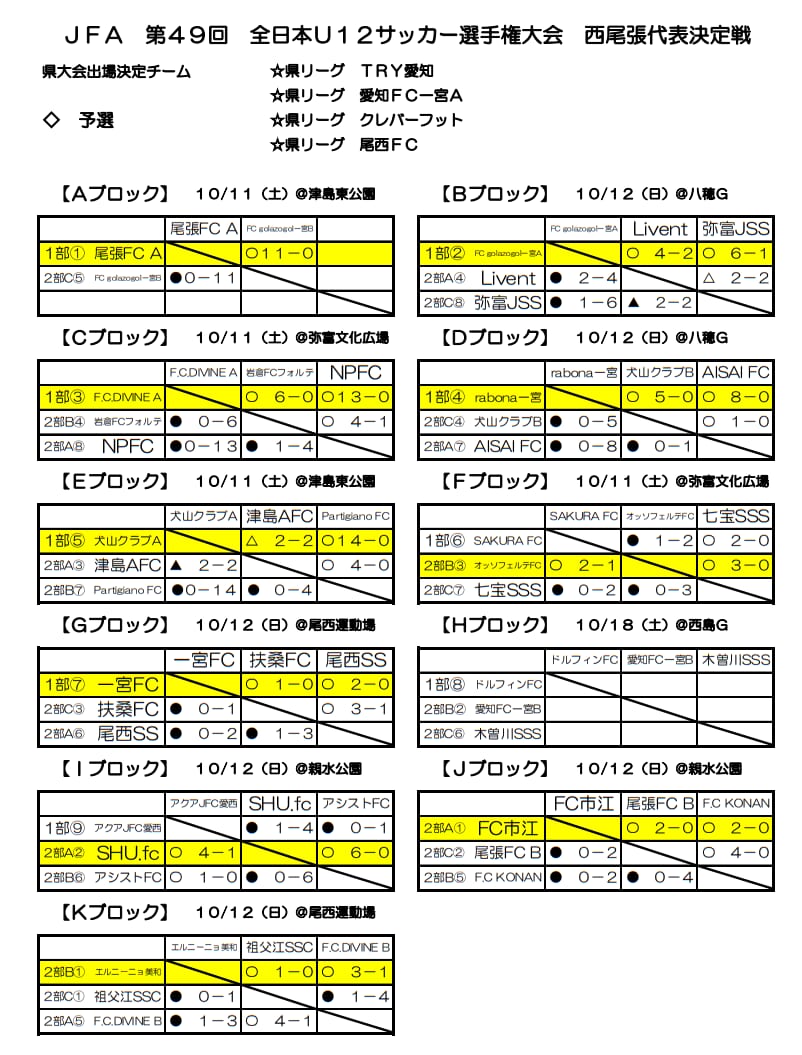 2024年度 第48回 JFA全日本U-12サッカー選手権 愛知 西尾張代表決定戦 10/19,20全結果掲載!愛知県大会出場6チーム決定!