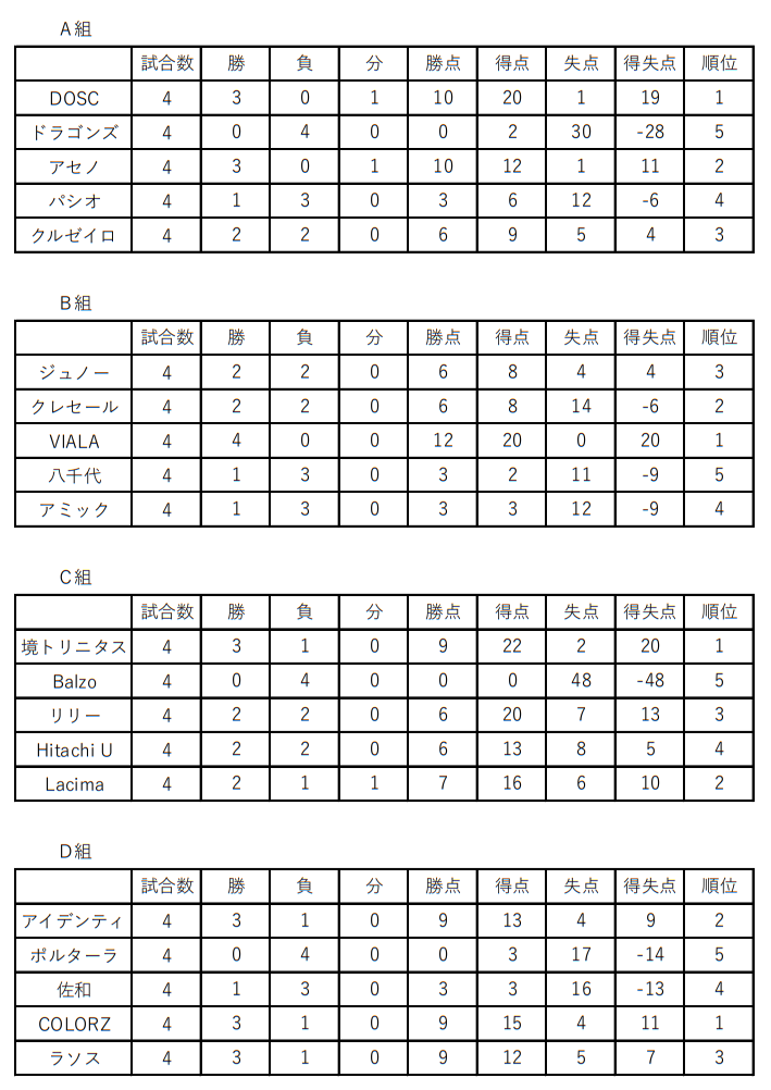 1位:BLOSSON、2位: 霞ヶ浦、3位:FC鹿島、4位:ヴェレン、5位:トラウム、6位:フェリース