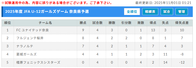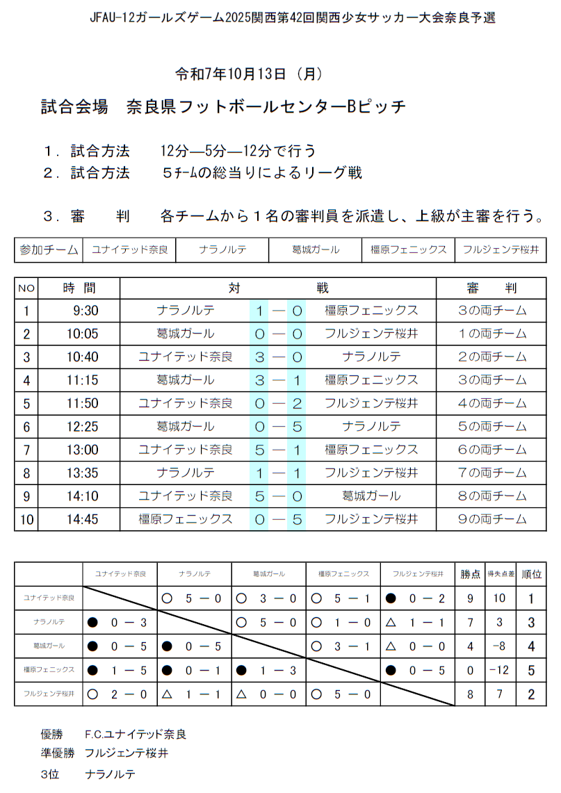 1位:FC ユナイテッド奈良、2位:フルジェンテ桜井、3位:ナラノルテ、4位:葛城ガールズ、5位:橿原フェニックスシスターズ