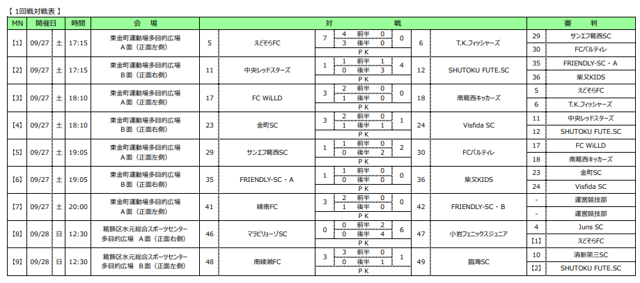(2)試合形式はトーナメント戦とする。試合が引き分けの場合は3人ずつの「ペナルティーマークからのキック」(以下「PK方式」と称す)より勝者を決める。決勝戦は前後半5分間の延長戦を行う。延長戦でも勝者が決まらないときはPK方式とする。