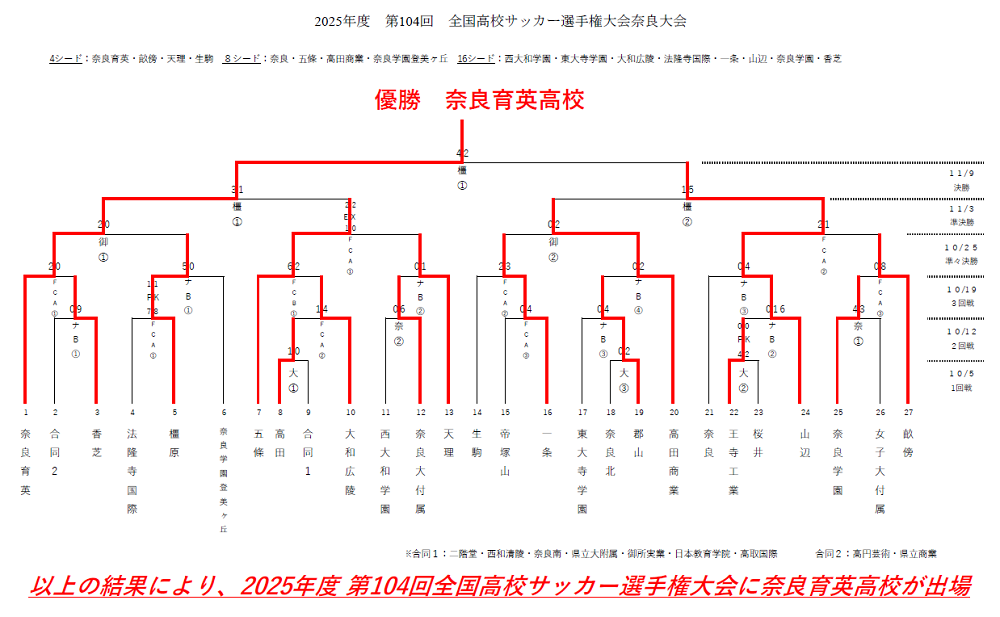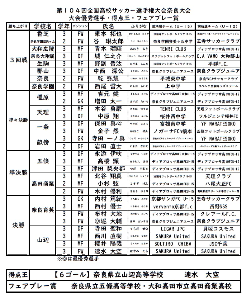 大会優秀選手・得点王・フェアプレー賞掲載!2025年度 第104回全国高校サッカー選手権 奈良県大会 優勝は奈良育英高校!5大会連続18回目の全国大会へ