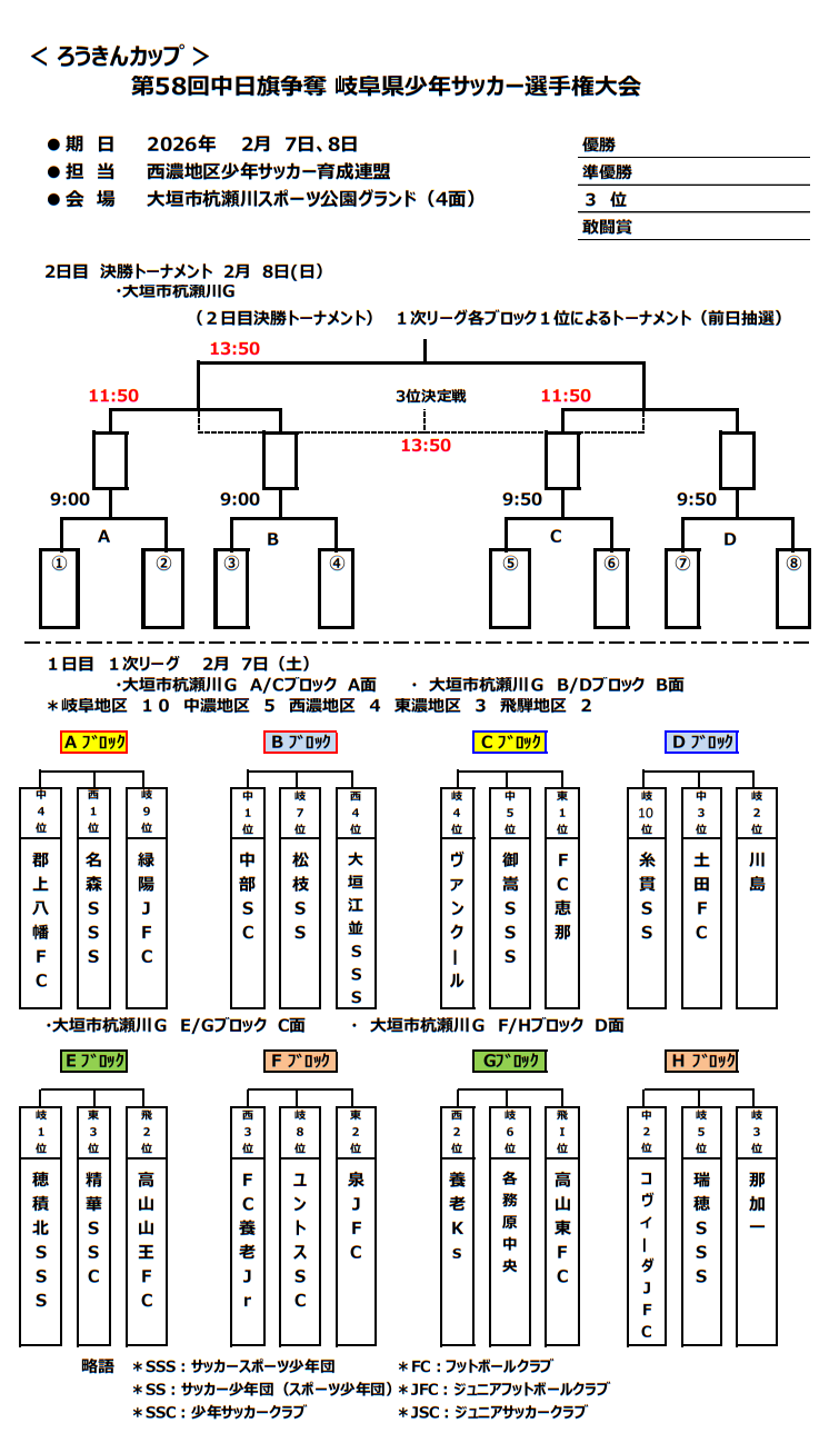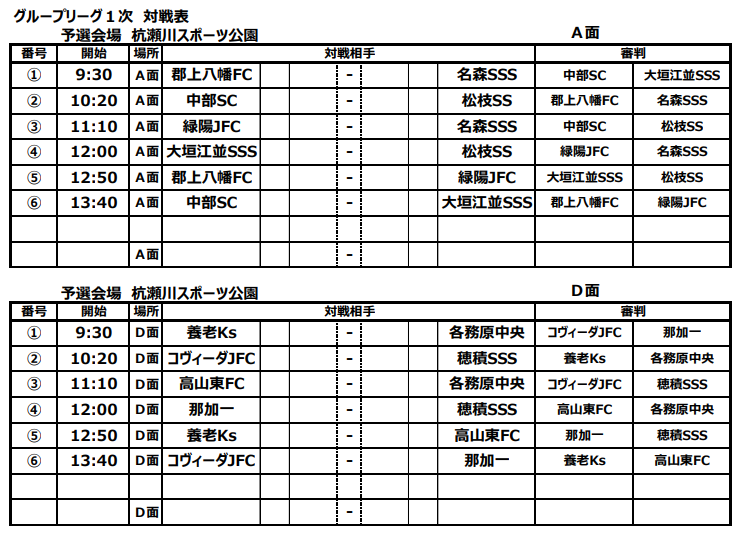 郡上八幡FC(中濃4位)、名森SSS(西濃1位)、緑陽JFC(岐阜9位)