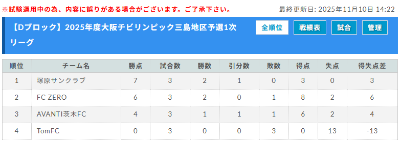 1位:塚原サンクラブ、2位:FC ZERO、3位:AVANTI茨木FC、4位:TomFC