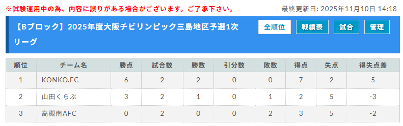 3位:高槻南AFC、1位:KONKO.FC、2位:山田くらぶ