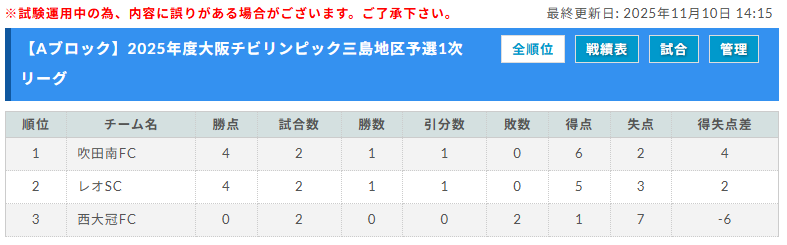 1位:吹田南FC、2位:レオSC、3位:西大冠FC