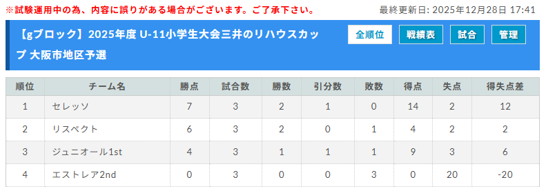 1位:REA、2位:住の江キッズ、3位:ジュニオール2nd、4位:エルマーノ