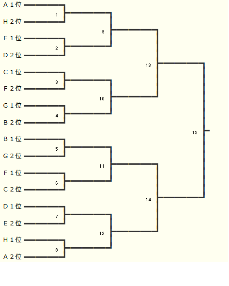 AブロックからHブロックまで3〜4チームずつの予選リーグを行い、各ブロック1,2位で決勝トーナメントを行う。