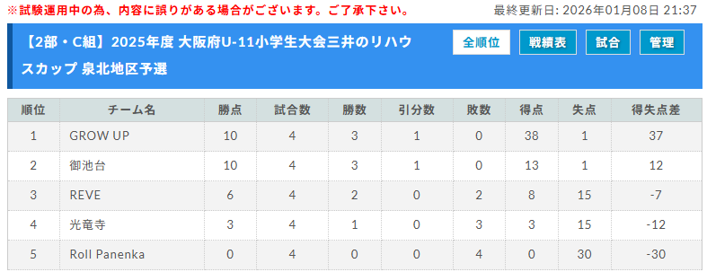 C組 12/27全試合終了 GROW UP FC、御池台FCが代表決定トーナメント進出