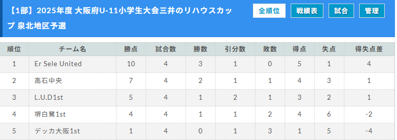 1位:Er Sele United FC、2位:高石中央JSC、3位:L.U.D FC 1st、4位:堺白鷺JSC 1st、5位:デッカ大阪FC 1st 和泉市FC 1st、RIP ACE SC
